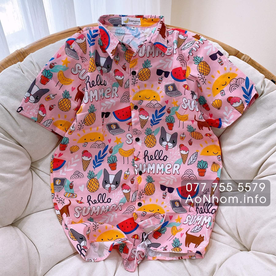[Hàng Đặt May] Áo Sơ Mi Hoạt Hình - Hello Summer Hồng - Áo Đôi Nhóm Lớp Team Building